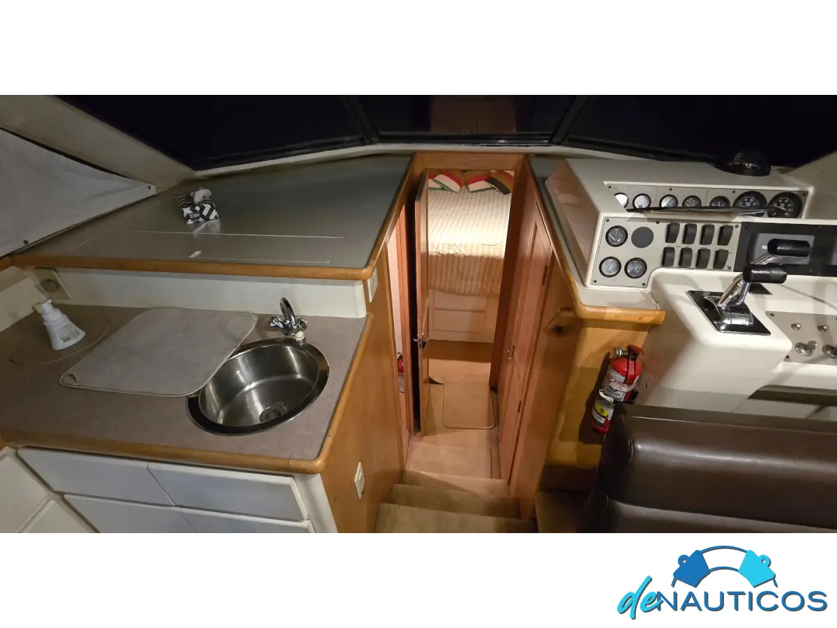 El Carver 370 Voyager presenta una distribución de cubierta elevada. Desde la cabina, a través de las amplias puertas correderas, se accede al cómodo salón. Subiendo un escalón a babor se encuentra la cocina completa. Frente a la cocina se encuentra una dinette convertible en camas.