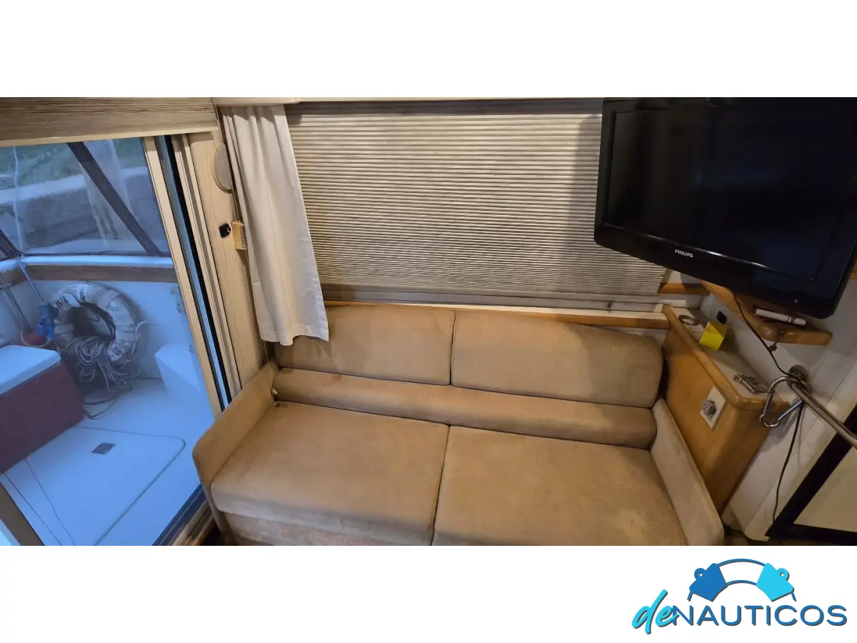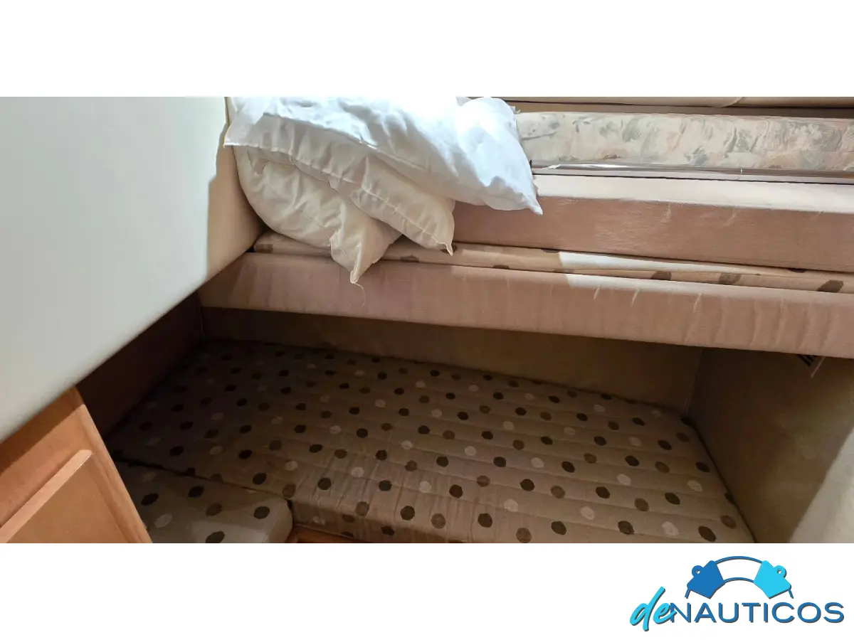 Sus amplios ventanales envolventes ofrecen abundante luz natural y magníficas vistas. El camarote principal, el de invitados y el baño se encuentran a proa y bajando un escalón.
