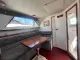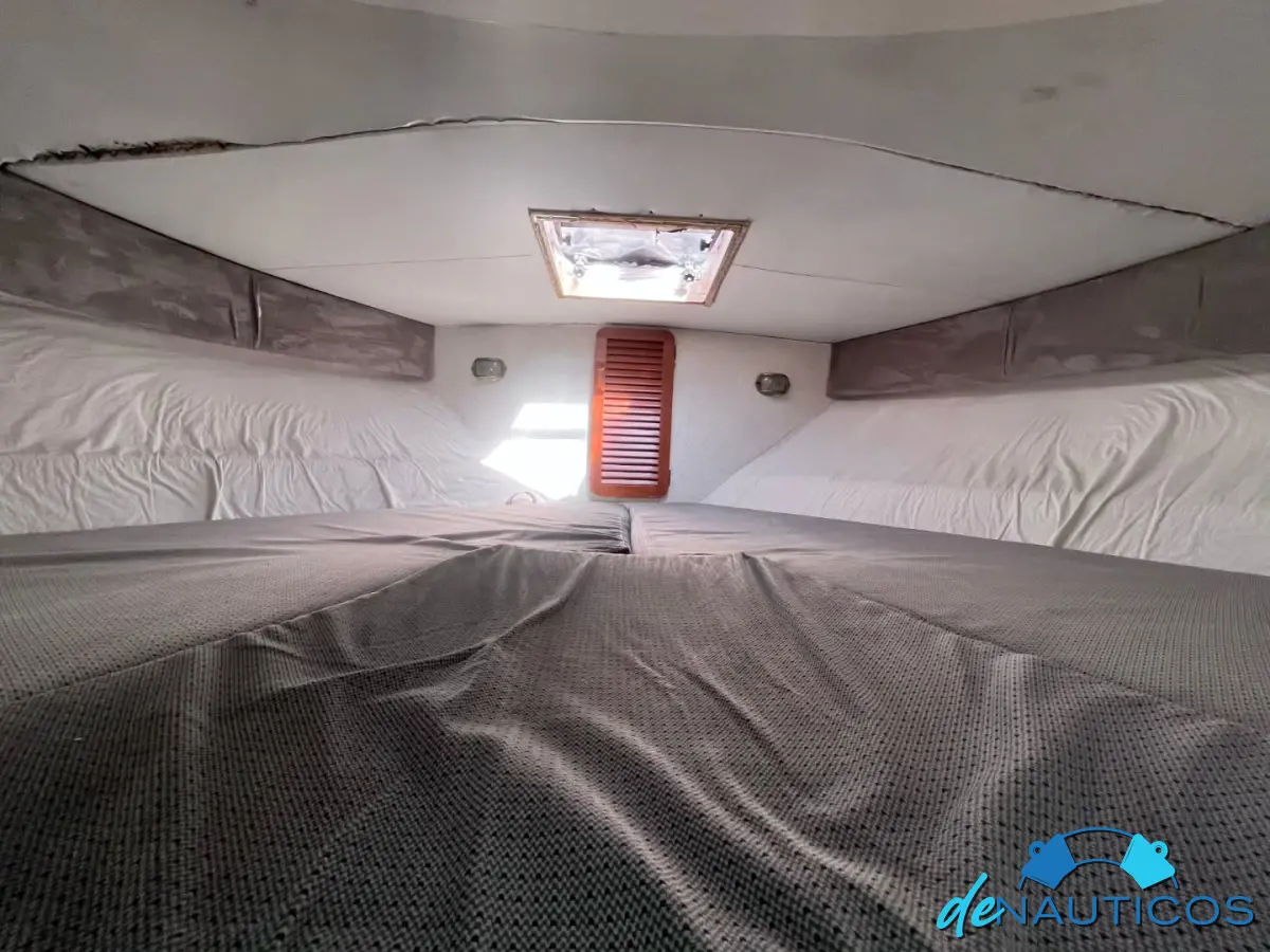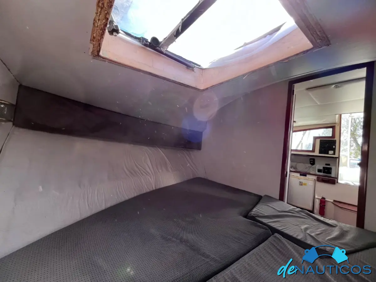 Cama triangulo doble en proa, baño compartimentado a estribor, servicios a estribor, sillón en L con mesita a babor, conejera a popa, amplio salón y muy buena altura interior, amplio cockpit, flybridge, solarium a proa, planchada de popa.